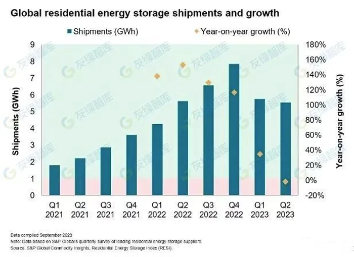 2023年以來,戶儲市場加速降溫已成行業公認的事實,與2022年的盛況相比可謂“冰火兩重天”。根據標普全球(S&P Global)的數據,全球戶用儲能系統出貨量在2023年第二季度首次同比下降,這也是有記錄以來首次出現下降——同比下降2%。